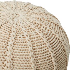 - Enjoy this cotton knitted round Pouf in any room of your home. Perfect for putting your feet up or using it as a small extra Seat when company is over. Easy to store in a corner or by the bed when not in use, This pouf not only looks cute but is functional too.