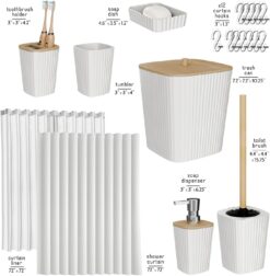 - Complete Bathroom Set: Toothbrush holder, tumbler, soap dispenser, soap dish, bathroom trash can, toilet brush and holder set, and fabric shower curtain set with clear shower curtain liner and 12 shower curtain hooks.