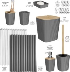 - Grey Bathroom Accessories Set: Incorporate Grey bathroom decor with our coordinated bathroom accessory set for bathroom organization. Our Grey bathroom decor sets with natural bamboo accents create a stylish haven.