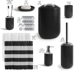 - Complete Black Bathroom Set: Includes toothbrush holder, tumbler, soap dispenser, soap dish, black bathroom trash can, toilet brush, and fabric shower curtain set with plastic shower curtain liner and 12 shower curtain rings.