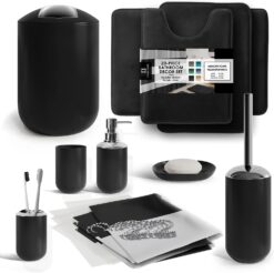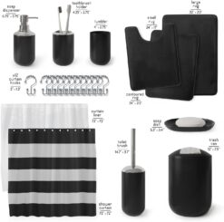 - Bathroom Sets with Shower Curtain and Rugs: Includes 3 bathroom rugs, toothbrush holder, tumbler, soap dispenser, soap dish, black bathroom trash can, toilet brush, and fabric shower curtain set with plastic shower curtain liner and 12 shower curtain rings.