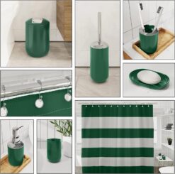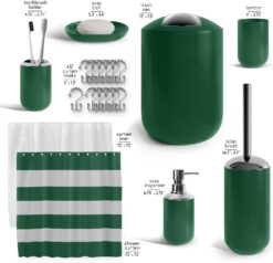 - Complete Green Bathroom Set: Toothbrush holder, tumbler, soap dispenser, soap dish, bathroom trash can, toilet bowl brush and holder, and fabric shower curtain set with plastic shower curtain liner and 12 shower curtain rings.
