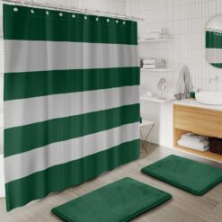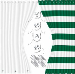 - Green Shower Curtain: Our cloth shower curtain made of durable, wrinkle-resistant polyester, with reinforced header and hook holes; measures 72”x72”.