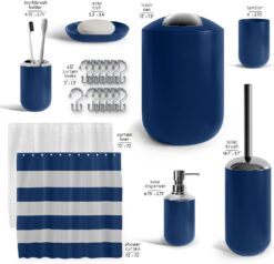 - Blue Bathroom Set: Includes toothbrush holder, tumbler, soap dispenser, soap dish, bathroom trash can, toilet bowl brush and holder, and fabric shower curtain set with plastic shower curtain liner and 12 shower curtain rings.