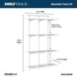 The ClosetMaid 4 ft. ShelfTrack Utility Organizer Kit offers shelf adjustability for a custom fit. It is perfect for your pantry, as well as laundry room, closet or garage. The 5/8 in. wire spacing helps prevent smaller items from tilting over or falling through. 16 in. Shelf depth means more space for storing bulky items and boxes securely.