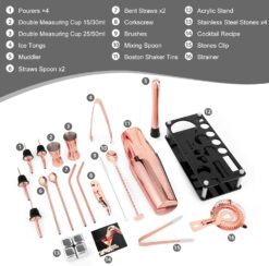 | Included Components | 20oz & 24 oz Boston Shaker Tins, 4 Pourers, Double Measuring Cup 15/30ml & 25/50ml, an Ice Tongs, a Muddler, 2 Straws Spoon, 2 Bent Straws, a Corkscrew, a Brushes, a Mixing Spoon, 4 Stainless Steel Stones, a Cocktail Recipe, a Stones Clip, a Strainer, an Acrylic Stand |