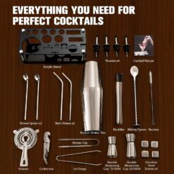 | Included Components | 20oz & 24 oz Boston Shaker Tins, 4 Pourers, Double Measuring Cup 15/30ml & 25/50ml, an Ice Tongs, a Muddler, 2 Straws Spoon, 2 Bent Straws, a Corkscrew, a Brushes, a Mixing Spoon, 4 Stainless Steel Stones, a Cocktail Recipe, a Stones Clip, a Strainer, an Acrylic Stand |