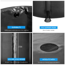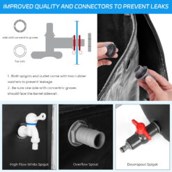 - 【No leaking】Our rain barrels are built with super high quality material that prevents water from leaking from the bottom. Our 3-ply, UV and heat resistant PVC material and water-tight washers combine to make a unique leak free technology that keeps the barrel from leaking and stores water clean and safe, even under extreme heat or pressure.