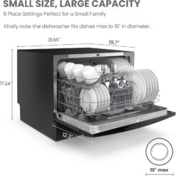 - 6 Place Setting- A perfect size (H17.2″×W21.6″×D19.7″) for 2-3 people, COMFEE’ compact dishwasher is suitable for dorms, RVs, and apartments. This countertop dishwasher can fit up to 70 pieces of tableware and has a plate size of up to 10 inches in diameter. Note: COMFEE dishwashers are tested at the factory before they are shipped. If your new dishwasher has some water inside, this is normal.