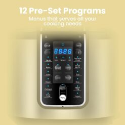 - Quick One Touch Kick Start with 12 Preset Smart Programs– Pressure cook, sauté, bake, stew, steam, oatmeal, slow cook, sauté, soup/ broth, egg, rice, bean/chili, yogurt.