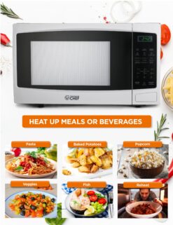 Heat and re-heat your favorite foods and beverages with this COMMERCIAL CHEF microwave oven countertop. With an impressive capacity of 1.1 cubic feet, this 1000 watt microwave oven is designed for countertops and will fit easily on kitchen countertops in homes, apartments, RVs, dorms, and more. Weighing only 30.9 lbs., you can transport this portable microwave anywhere. This small microwave oven has impressive power levels such as Time Cook, Time Defrost, Weight Defrost, & Power. Preset Menu Options include Popcorn, Potato, Pizza, Frozen Vegetable, Beverage, & Dinner Plate. Also included on the digital display is Clock & Kitchen Timer. Additional features include a door-style push button, an efficient turntable that guarantees even heating, child safety lock, yellow & green LED lighting, and sophisticated white plastic design.