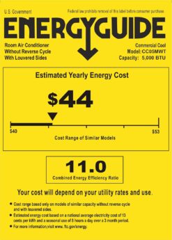 This Commercial Cool 5000 BTU window air conditioner is a must-have for instant cooling relief when you need it in any room in your home. Bedrooms, living rooms, home offices and ideal for apartments—this small window air conditioner is a perfect addition when the warm weather months roll in. With a high-quality compressor offering 5,000 chilling BTUs, you can circulate air with the fan only function or cool a room up to 150 square feet. This window unit uses R32 refrigerant which has zero impact on the ozone layer, so you can stay comfortable indoors without harming the planet. In fact, this 5k BTU window air conditioner improves energy efficiency by up to 10% compared with R-410A. Because R32 is more efficient than R-410A, less refrigerant is needed, increasing the life of the air conditioner and the planet, 11 CEER, 3.25 EER 450 Watts, 8.03 amps, 337.5 kWh. 115v, 60Hz 4.5A. 3-prong LCD (5-15P) plug type. Components: Window AC, All Necessary Installation Pieces. CSA safety certified. Product consists of 13% steel, 6% aluminum, 44% ceramic, 3% plastic, 11% glass, 1% copper, 2% nickel. Superior ISTA-6A packaging to ensure safe delivery.