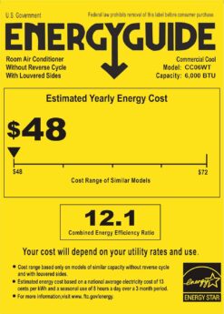 This Commercial Cool 6000 BTU window air conditioner is a must-have for instant cooling relief when you need it in any room in your home. Bedrooms, living rooms, home offices and ideal for apartments—this small window air conditioner is a perfect addition when the warm weather months roll in. With a high-quality compressor offering 6,000 chilling BTUs, you can circulate air with the fan only function or cool a room up to 250 square feet. This window unit uses R32 refrigerant which has zero impact on the ozone layer, so you can stay comfortable indoors without harming the planet. In fact, this 6k BTU window air conditioner improves energy efficiency by up to 10% compared with R-410A. Because R32 is more efficient than R-410A, less refrigerant is needed, increasing the life of the air conditioner and the planet, Enjoy the electronic digital display and a handy remote control, so you don’t have to get up from the couch in humid, sweltering weather. 12.1 CEER, 3.58 EER 490 Watts, 8.03 amps, 367.5 kWh. 115v, 60Hz 4.5A. 3-prong LCD (5-15P) plug type. Window installation is quick, efficient and seamless. Features low, medium, and high fan-only function well as dehumidifier. Components: Window AC, Remote Control, All Necessary Installation Pieces. CSA safety certified. Product consists of 28% copper, 24.6% steel, 8% aluminum, 6.6% plastic, 13.2% galvanized metal, 2% HIPS, 2.01% ABS, 2% EPS foam, 6.24% paper, 4.09% polyethylene foam, 3.26% other material. ISTA-6A packaging included.