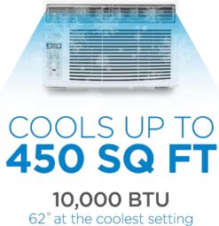 - IDEAL FOR BEDROOM & OTHER SMALL ROOMS: Our 10000 BTU AC unit (18.98″ x 21.46″ x 14.65″) offers consistent, quick and highly effective cooling for rooms up to 450 square feet. Perfect for bedrooms, offices, playrooms, cabins, living rooms and apartments. Operates in the form of a dehumidifier and includes fan-only options. With a weight of 57.3 lbs, this Energy Star air conditioner fits snugly into windows with easy installation & mounting hardware.