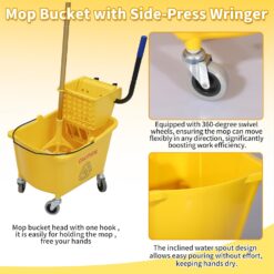 - 35-quart mop bucket with side-press wringer combo for cleaning floors or mopping up messes; Designed for large-scale cleaning tasks, suitable for hotels, shopping malls, offices, schools, hospitals, and other commercial spaces.