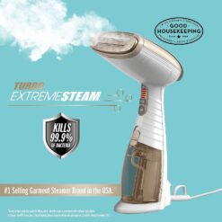 Experience the most powerful handheld fabric steamer with the Conair Turbo Extreme Steam Hand Held Fabric Steamer (model GS59). Advanced steam technology is driven by an exclusive 1875-Watt steam generator. The steam is hotter and the results are faster! 5 steam settings from delicate to supercharged turbo allow users to instantly release wrinkles on any garment or fabric and the built-in creaser for perfect pleats and folds. With 40-second heat up and up to 20-minute steam time, this powerful Conair garment steamer is the #1 selling garment steamer in the USA. The 3-in-1 attachment has a silicone band to pull fabric taut for easier steaming, a delicate fabric spacer, and bristle brush to loosen fibers for faster steam penetration. Instantly release wrinkles, refresh upholstery, and give garments a professional, fresh-pressed look with the powerful Conair Turbo Extreme Steam Handheld Fabric Steamer. Kills 99.9% of Bacteria (Bacteria reduction rate was measured after exposing the tested bacteria samples for 1 minute at a 1cm distance from the garment steamer’s faceplate. Bacteria tested were Methicillin-resistant Staphylococcus aureus (MRSA) and Klebsiella pneumoniae).;The product voltage arrange is 110V