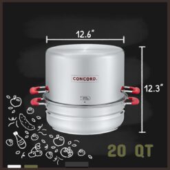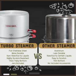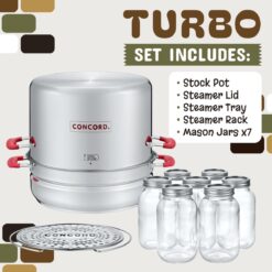 - Concord’s 20 quart stainless steel Turbo Steam Canner, includes a steamer canner, rack, tray, and 7 glass quart mason jars.