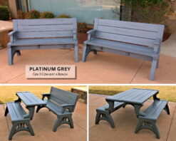 The unique Platinum Gray Convert a Bench instantaneously converts a benchâ„¢ to a 3 person table and in combination with a second bench, you can create a full 6 person picnic table! The Convert-A-Bench is a useful item to bring along during outdoor trips because of its multiple functions. For one, it can be easily transformed into a picnic table by simply folding the back and armrests forward to create a single-sided table. It can also be used as an outdoor bench to relax on the patio, or into a table for dining in the garden. The lightweight piece is extremely easy to assemble and can be carried anywhere, making it a practical companion during camping trips. The Convert a Bench is made out of all-weather vinyl and resin that makes the bench entirely maintenance-free. Note: This price is for 1 Convert A Bench. Purchase 2 benches in order to make a complete table.