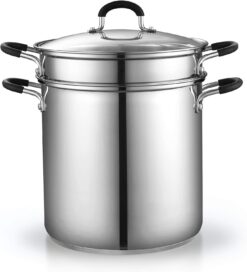 - 【4-Piece Pasta Multipots】Includes: 12 quart stockpot, steamer insert, pasta insert and pot, and a tempered glass lid.