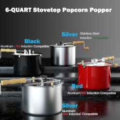 - INDUCTION COMPATIBLE – Induction Compatible, Popcorn Popper is suitable for gas, electrical, ceramic, glass, etc., Not dishwasher safe, wipe with a cloth to clean.