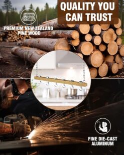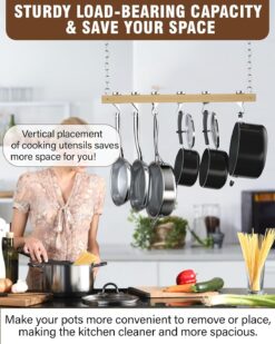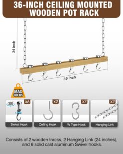 The Cooks Standard Ceiling Mounted Wooden Pot Rack, Single Bar, 36-Inch has a 36 inch single bar made of 2 wood tracks that is supported by 2 (24 inch) chains. The pot rack also comes with 6 swivel hooks that can be turned 360 degrees to adjust cookware. Supports around 30 pounds. Brackets and hooks are made of solid cast aluminum for a modern appearance and to coordinate with your kitchen and cookware’s style. Natural wood track is smooth and durable and can be mounted on a ceiling or against a wall. Saves space and helps with organization. Installation is easy with a Phillips screwdriver. Extra hooks are available, please purchase separately.