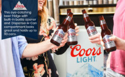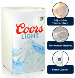 - Show off your unique style The eye-catching official Coors Light’s logo with Rocky Mountain graphics and built-in bottle opener make this the perfect gift for your favorite beer-lover. This unique bar fridge will be the showpiece of their den or games room!
