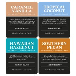 - CAFÉ QUALITY COFFEE BREWED BY YOU: This variety pack contains some of the most popular coffee flavors, we’re sure you will find a favorite between Hawaiian Hazelnut, Tropical Coconut, Southern Pecan and Caramel Vanilla