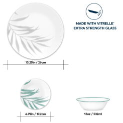 Be inspired by leafy palms on a breezy tropical morning. This beautiful dinnerware set captures your inspired style and the pretty layering from light to lush brings your table setting to life. The Vitrelle® glass is durable and eco-friendly – and transfers easily from microwave to table to dishwasher. Every meal will feel like a vacation.