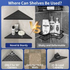 - 【Space Saving & Modern Style】Our corner floating shelves are designed for organizing your bathroom and kitchen. They are ideal for holding your shampoo, body wash, cream, razor, seasonings and more. Please note that shelves are ONLY for 90°corners, it is a great choice for both narrow and broad bathroom spaces.