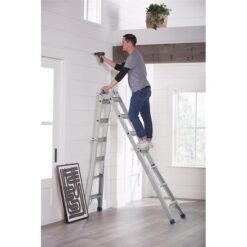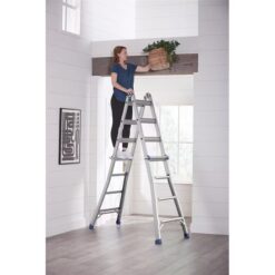 We’ve taken convenience to new heights with this 5-in-1 ladder. Whether you need to clean out your gutters or change a picture on the stairs, it adjusts to any position without tools. The COSCO Articulating Ladder features a Multi-Position Ladder System with a Max Reach of up to 18-ft in the wall ladder position. This transformative ladder offers 4 positions as step ladder, 7 heights as extension ladder, 7 positions as stairway ladder, 3 heights as scaffold, and 3 heights as wall ladder. Featuring flared legs with replaceable, slip resistant feet for maximum stability and a locking hinge in closed position for added safety. Meets ANSI Type 1A Extra Heavy Duty Industrial Work Load of 300 lb rating. Max Reach assumes a 5 ft 6 inch person with a vertical 12 inch reach.