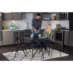 Be ready for guests with the Cosco 5-Piece Folding Table and Chair Set, offering instant seating for four. Comfortable for entertaining and compact for storage, this set features durable steel frames with a powder-coated finish. This black set comes with a sturdy 34″ square table featuring a low maintenance and easy-to-clean vinyl top. The four chairs have vinyl padded seats and molded backs for additional comfort. The table and chairs are built with sturdy steel frames and feature rubber tips to protect your floors.