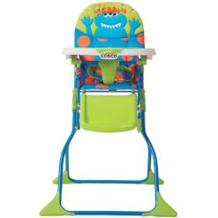 - Lightweight and stable, with a simple, no-nonsense design featuring a brightly colored monster, this Cosco portable high chair folds flat after mealtimes and stands on its own for ease of storage or travel