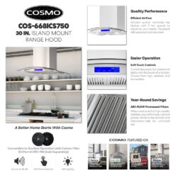 Cosmo 668ICS750-DL 30 in. Ductless Island Range Hood in Stainless Steel with LED Lighting and Carbon Filter Kit for Recirculating