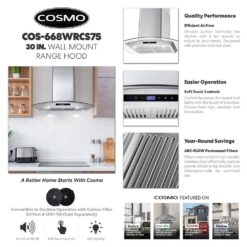 Cosmo’s COS-668WRCS75 combines curved glass and stainless steel perfect for any modern kitchen. The flowing designs of our 30″ wall mount range hood kitchen hood come with a 380 CFM centrifugal motor that traps smoke and fumes from lingering in your home. Cosmo Range Hoods include ARC FLOW Permanent Filters that are the only filters needed to provide greater airflow and are dishwasher safe for easy clean-up. Featuring a High-tech LCD touch control panel to manage multiple functions, including 3 fan speeds and LED lighting for added visibility.