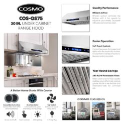 Cosmo COS-QS75 30 in. Haven Collection 500 CFM Ducted Under Cabinet Range Hood, Touch Controls, LED Lights, Stainless Steel