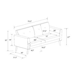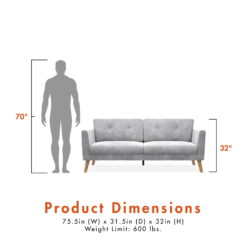 - Sofa dimensions: 75.5”L x 31.5”W x 32”H. Net weight: 94 lbs. Weight limit: 600 lbs. Shipping dimensions: 71”L x 27.5”W x 14.5”H. Gross weight: 102 lbs. 1-year limited warranty