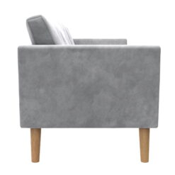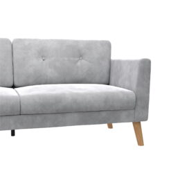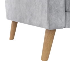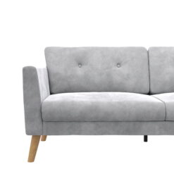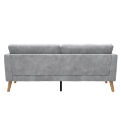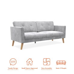 - Built for small spaces, its sturdy 3-seater wood frame with center support leg, open arms, button tufted back, tall wooden legs and relaxed sofa cushions make entertaining guests a delight