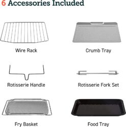 - RECIPES & ACCESSORIES: Check out the included 100 recipe book and 6 accessories such as the crumb tray, fry basket, food tray, wire rack, and rotisserie fork set for more cooking options. To purchase a toaster oven baking set, search “CAO1-3AC”