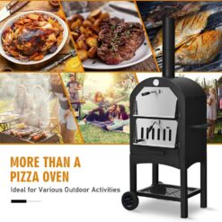 Take this portable pizza oven to equip your patio!Our pizza heater has enamel wires and 12″ pizza stone for you to make pizza, burger, baked fish and roast meat. And its temperature can reach up to 662°F. Remember to pre-heat it for 3-5 minutes. You can open or close the shovel of the door or chimney to control the fire. Besides, dual thermometer allows you to know the internal temperature. 2 flexible PP wheels and convenient handle help you to easily move our pizza oven. Additionally, 2 steel legs and solid frame keep it strong and stable enough to offer long-lasting service life. What’s more, it has a waterproof oxford fabric cover, ash collector, mesh storage shelf, pizza peel and other accessories for more convenience.