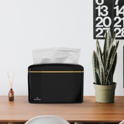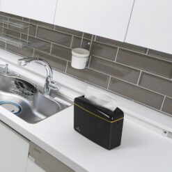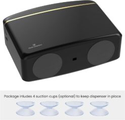 - SUCTION CUPS INCLUDED: 4 suction cups included (optional to use) to keep dispenser in place. This dispenser features a glossy black color and a sleek gold trim around the top. It has soft round edges and an eye catching high gloss coating. It’s modern, stylish, and such a necessity!