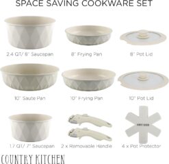 Country Kitchen Cookware Set with Removable Handle, Oven & RV Safe Pots and Pans Set, Cream Diamond, Original