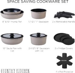 Country Kitchen Cookware Set with Removable Handle, Oven & RV Safe Pots and Pans Set, Grey/Black, Original