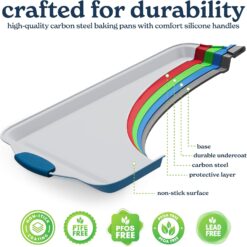 - Silicone Handles: Our bakeware sets non toxic are designed with safety in mind. The silicone handles ensure a secure grip, allowing you to easily and safely move your nonstick baking sheets in and out of the oven.