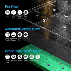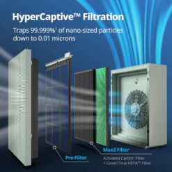 - [HyperCaptive Filtration System] Dynamic combination of a washable pre-filter, deodorization filter, and True HEPA Filter effectively reduces 99.999% of 0.01-micron particles in the air, including pollen, pollutants, and other allergens. It also reduces 99% of volatile organic compounds and odor.