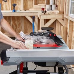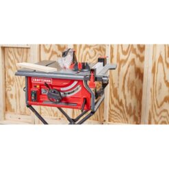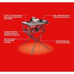 Craftsman 10 in. table saw has a powerful 15- amp motor that generates 5000 RPM designed for cutting various wood working materials with precision for jobsite and workshop task. The steel roll cage design is for added durability and strength while the detachable folding stand assist with ease of use and storage. The 27-3/8 in. x 21-7/8 in. cast aluminum table top provides 12 in. right and 10 in. left rip capacity. The 0 – 45 degree bevel allows for 3-1/8 in. cut at 0 degrees and a 2-1/4 in. cut at 45 degrees. This saw is perfect for on and off the jobsite.