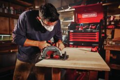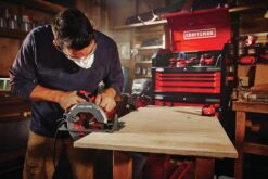 15 Amp 7-1/4-in Circular Saw delivers the power needed to complete everyday tasks. The high performance 5,500 RPM motor is ideal for fast and aggressive cutting while the beveling shoe pivots up to 55°. With a premium grade magnesium shoe, metal upper and lower guard, this saw is made to withstand harsh jobsite conditions.