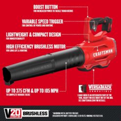 Quickly tidy up your yard with this V20* Brushless Cordless Axial Blower Kit. Featuring a powerful brushless motor and equipped with a 4.0Ah battery, you’ll be able to knock out heavy-duty clean-up tasks with up to 375 CFM and up to 105 MPH. Once the task is complete, conveniently store using the integrated VERSATRACK™ hook with the VERSATRACK™ system (sold separately). The V20* battery platform is compatible with CRAFTSMAN® V20* outdoor equipment and power tools. You’ll find the complete line of outdoor tools and equipment essentials for a job to make you proud.