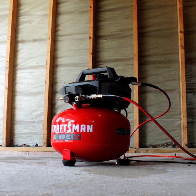 The Craftsman 6 Gallon Portable Pancake Compressor is your go-to tool, delivering 150 max PSI and 2.6 SCFM at 90 PSI. Its oil-free pump means less maintenance, and with dual gauges and two quick couplers, you can easily handle a range of tasks. Ideal for inflating tires, powering nail guns, or running air tools, this compressor is perfect for DIYers, homeowners, and professionals alike.