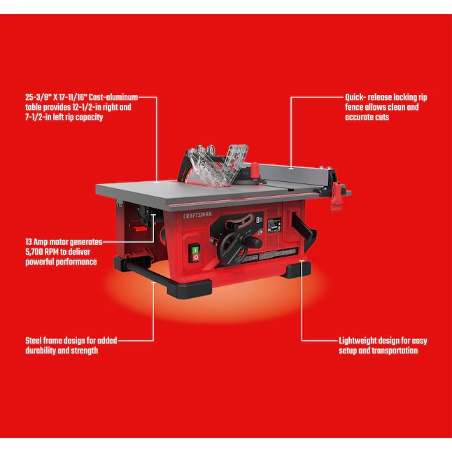Craftsman 8-1/4 in. table saw has a powerful 13- amp motor that generates 5700 RPM designed for cutting various wood working materials with precision for jobsite and workshop task.