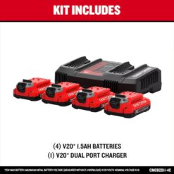 The V20* Dual Port Charger and 4-Battery Kit charges two batteries and a USB-compatible device (2.1 Amp max output) simultaneously, giving you the power to complete your DIY projects. The Kit includes 4 V20* 1.5Ah batteries with a V20* Dual Port Charger and is equipped with LED charging indicators that provide immediate state-of-charge feedback, so you can stay ahead of your power needs.